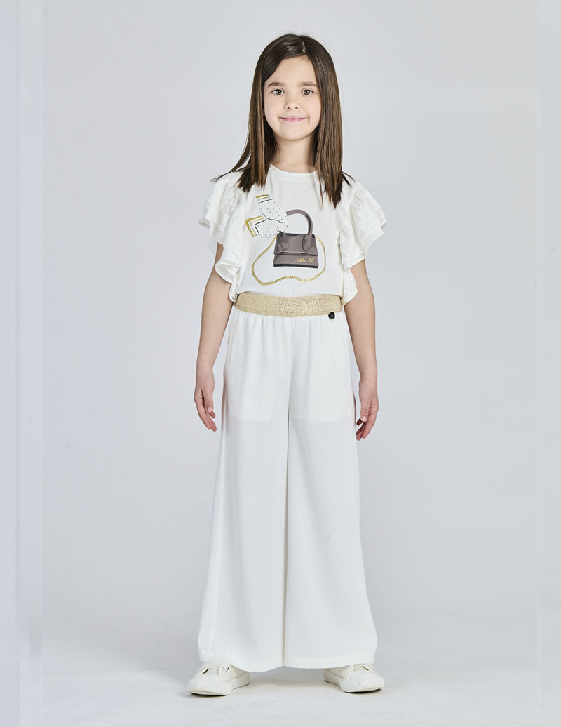 “T-SHIRT CROP STAMPA “”BORSETTA”” CON ROUCHES ALLE MANICHE” – “92% CO 8% SP ROUCHES 70% CO 30% NY”