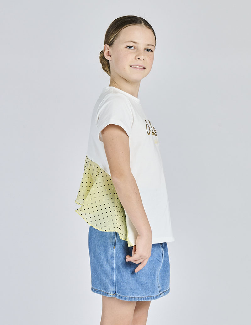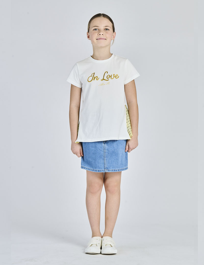 “T-SHIRT STAMPA “”IN LOVE”” CON ROUCHES DIETRO” – “92% CO 8% SP ROUCHES 100% PL